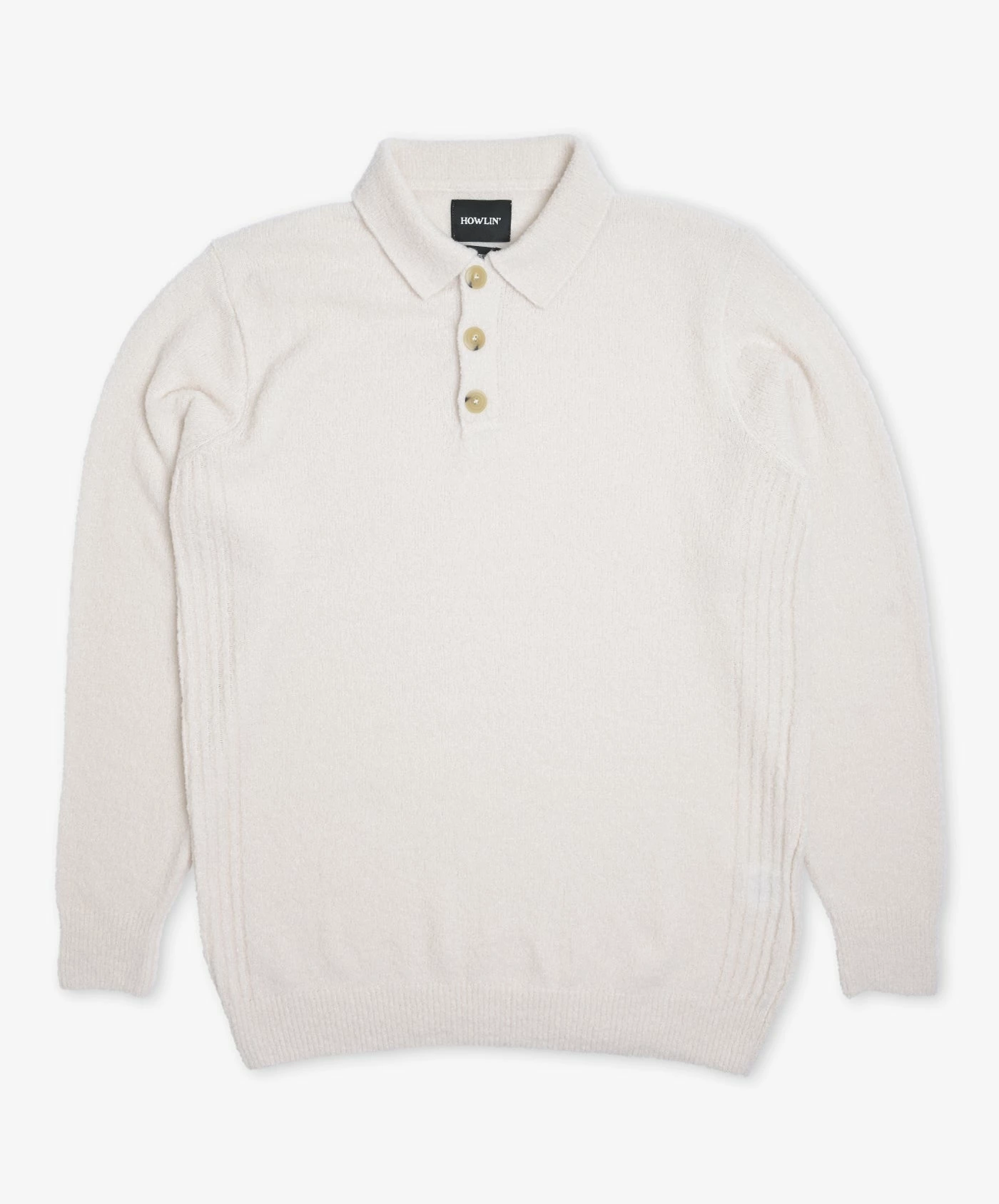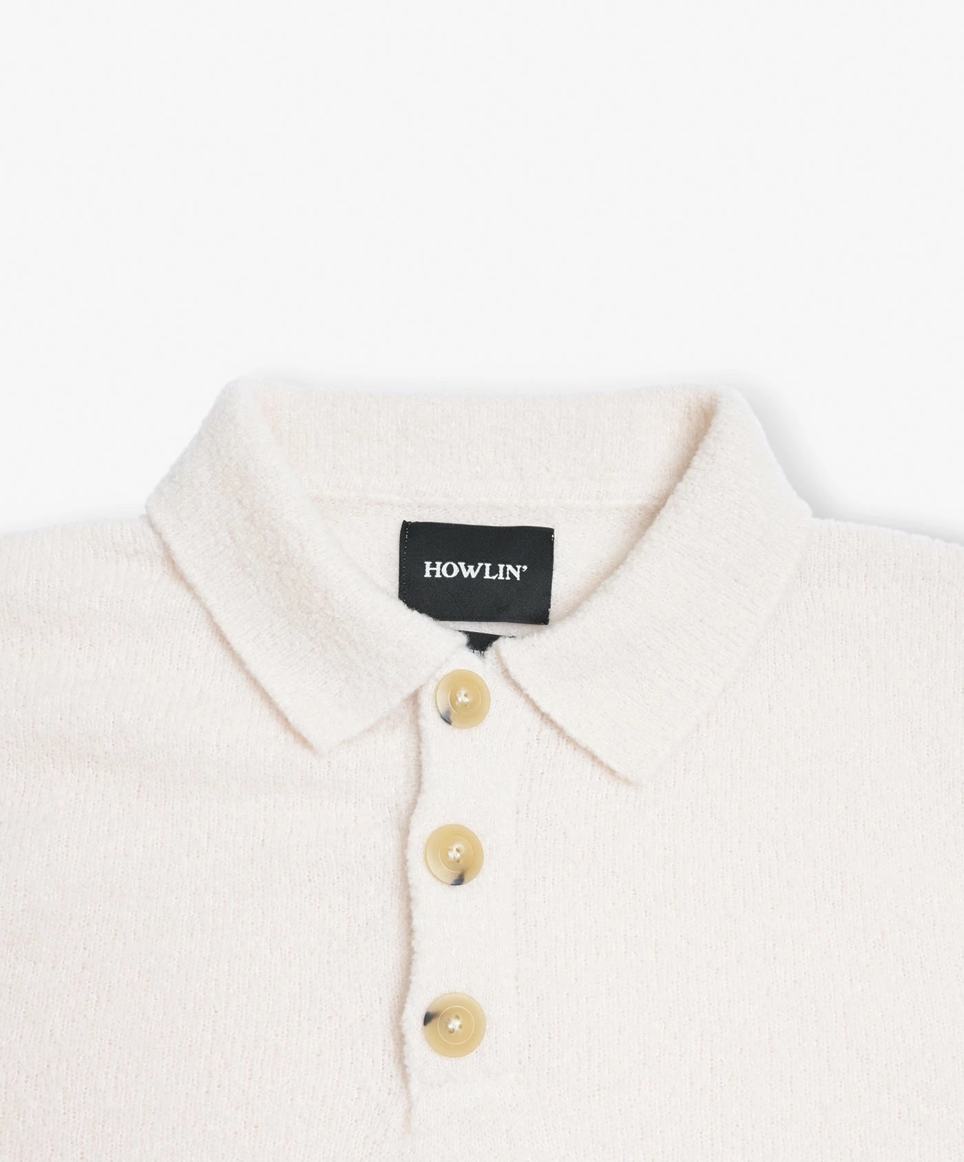 Howlin’s new super soft light yarn bouclé knit polo, with a nice rib detail at the sides.
