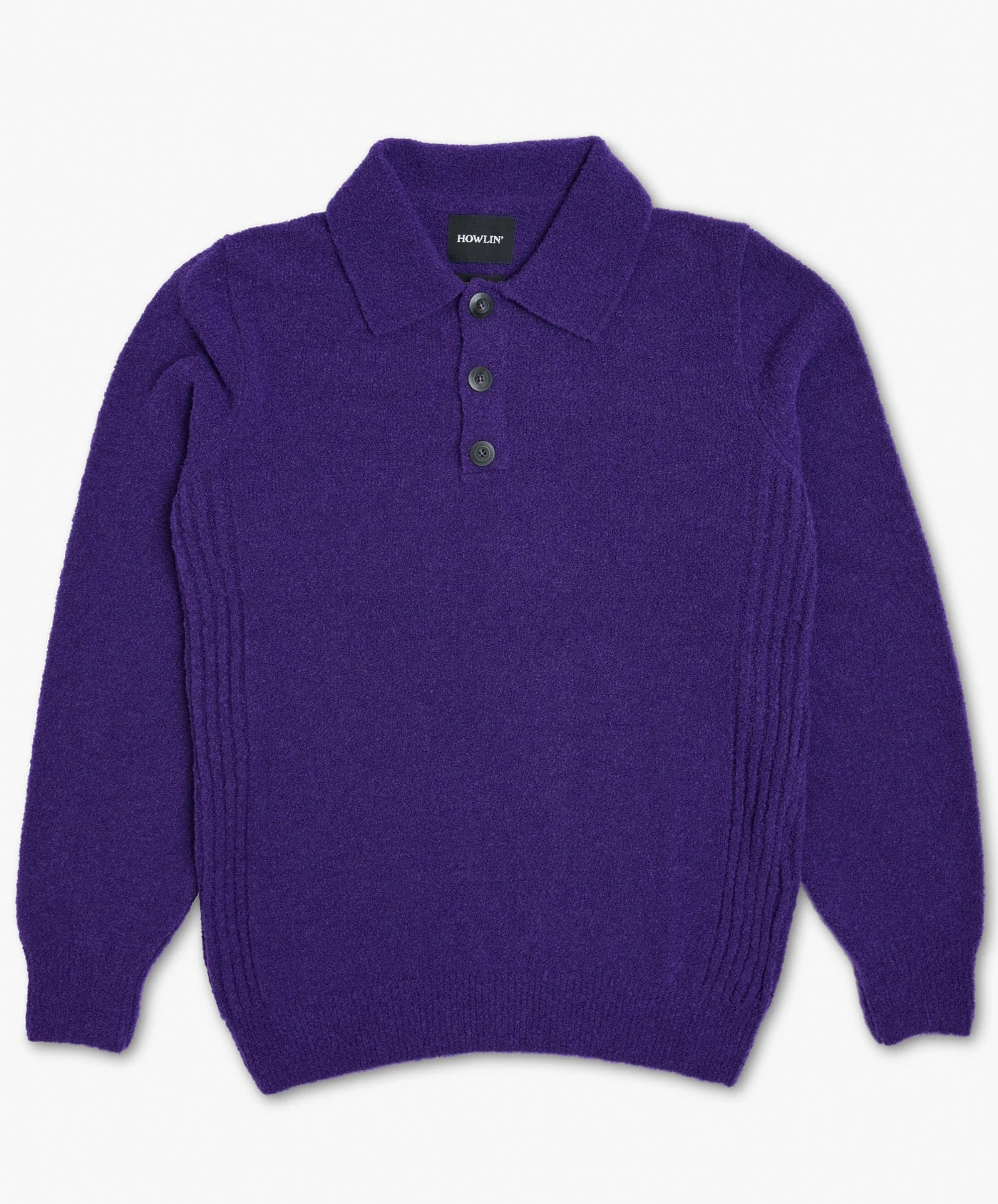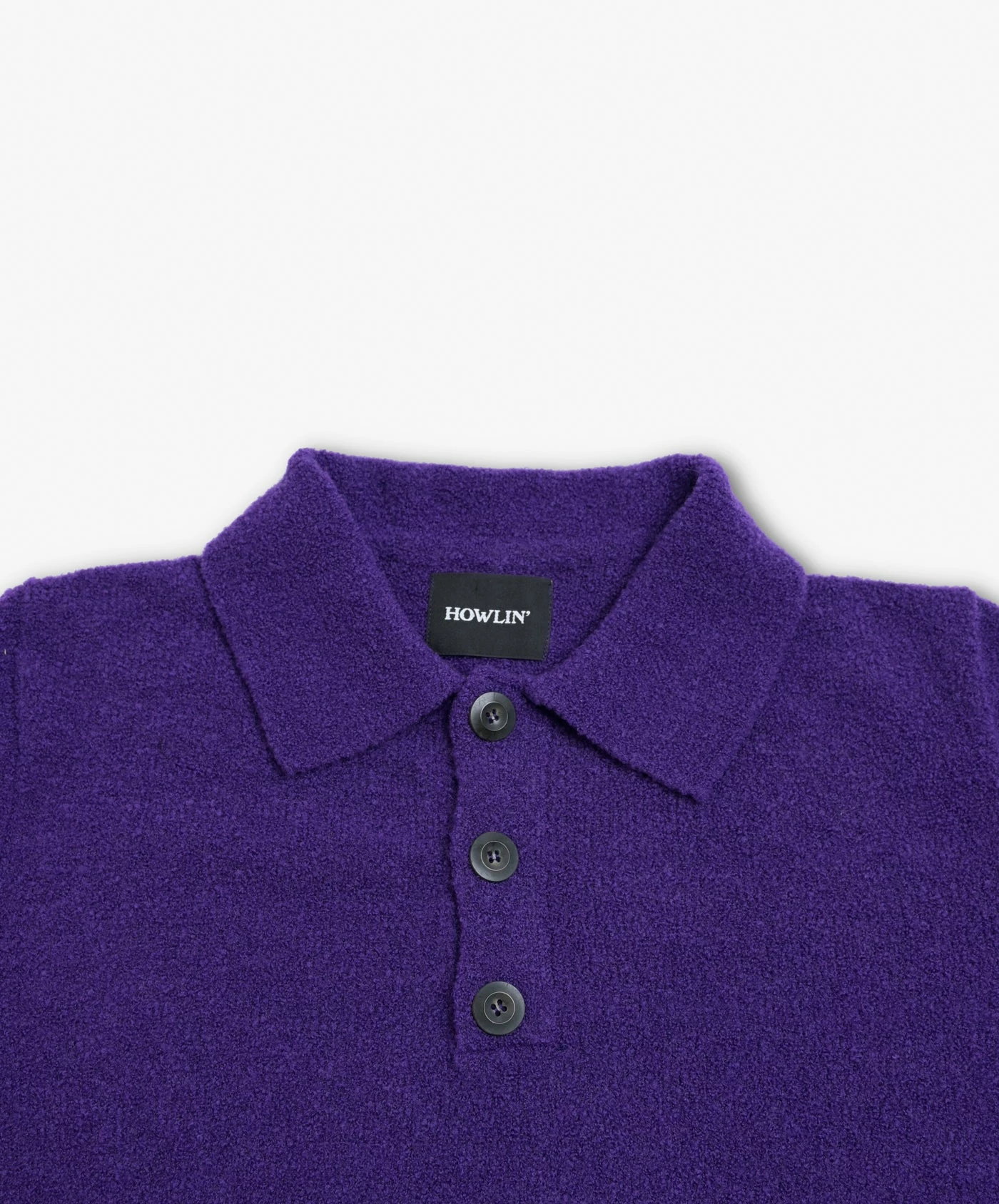 Howlin’s new super soft light yarn bouclé knit polo, with a nice rib detail at the sides.